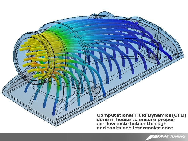 During development of AWE high horsepower turbos kits for the 997TT, AWE experienced excessively high intake air temperatures. Upon close examination of the stock intercoolers, AWE found they matched the same specs as the 996TT X50/GT2 design, which is suitable to 600hp, but not much beyond that. Since an OEM option was not available, and AWE power goals were well north of 700hp, AWE undertook the task to construct a completely new intercooler system. Compared to stock, AWE cores are 37% larger (422 cubic inches vs 308 cubic inches). In contrast to the stock cores, AWE are a high flow bar and plate style and are built to our charge row and fin count specs. These specifications resulted in improved intake temperatures by a massive 55F and improved drop pressure resistance through the core by 1 psi. Considering that extremely little trimming is involved to fit such effective units to the car, this is a huge engineering feat. In addition to the superior core and end tank design, the AWE kit also features 6-ply silicone hoses with gentle curves to prevent bursting under pressure. They are attached to the intake and turbos by stainless steel high force t-bolt clamps, and a molded lip is integrated where the hoses meet the turbos to imitate the factory locking mechanism. Further, AWE hoses use a Nomex braiding for superior strength, instead of more common polyester. The very best materials and industry-leading engineering separate this kit from all others on the market. Whether you are simply running enhanced software, or are planning on a larger turbo upgrade for your car, AWE intercoolers solve all heat-related issues that come with more turbo boost. Keeping your intake air temperatures low results in more power, better engine output stability when outside temps climb, and the safety margin needed when pushing the limit. Please note, the AWE Performance Intercooler is for racing use only.