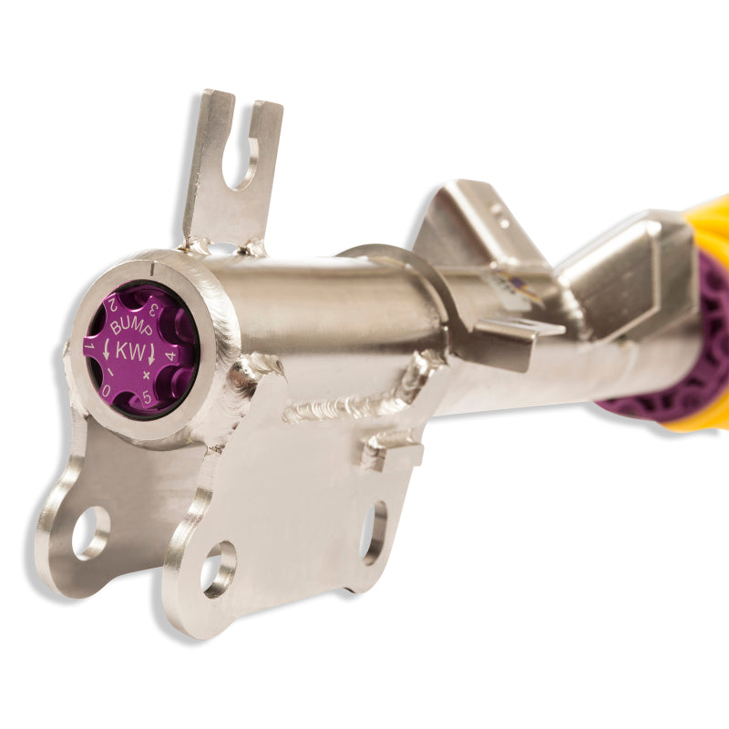 Cutting-edge motorsports technology -or more performance on the road. Like every suspension product developed by KW automotive and manufactured in Germany, the KW Variant 3 Coilover suspension kit also provides a significant improvment on the road. Thanks to the high-quality dampers, springs, and elastomer spring elements, pitching and rolling movements during load changes such as evasive maneuvers, cornering, acceleration, and braking are significantly reduced. The braking distances are also shortened. Thanks to improved support and feedback, drivers not only feel more confident but driving in everyday life is improved. With compression and rebound stage damping, that can be set separately and independently of each other, the damper setup can be customized to your personal driving preferences or vehicle changes such as weight, tire characteristics, or altered vehicle rigidity. True performance optimization is only possible with this unique, patented system. For example, this allows the compression damping force to be increased and get more grip from the tires, to improve cornering behavior and reduce squat without simultaneously altering the rebound stage damping which is optimally matched to the spring rate ? a scenario which results in reduced grip and the associated loss of performance. The KW Variant 3 INOX-LINE coilover kit is the ideal tool for performance-oriented drivers and experienced tuning enthusiasts who place a strong emphasis on the overall performance of their suspension. The Variant 3 features patented TVR-A and TVC-A technology -hat provides separately adjustable rebound and compression damping. The extensive Adjustment -ange of the independently configurable rebound and compression make it easy to directly influence the steering behavior, directional stability, grip and handling characteristics for confident and repeatable results at the limit of driving dynamics.