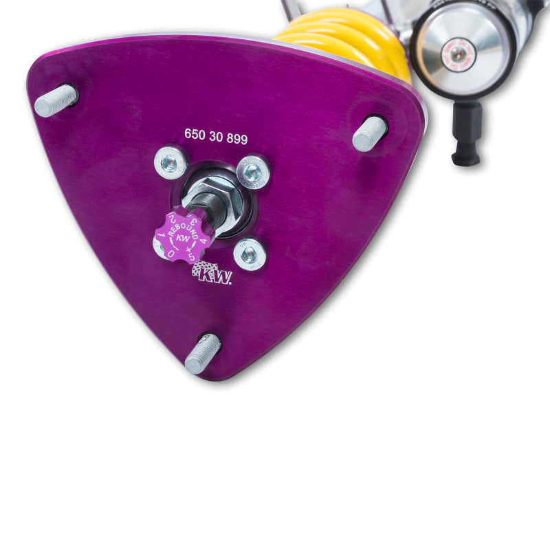 Using the Nordschleife as it's testing grounds and the 7-post rig, KW developed it's 3-way Clubsport coilover kit. Wheel loads, vehicle weight and chassis reinforcements (increased body stiffness) can all be taken into consideration with Adjustment -apabilities of the 3-way Clubsport. The KW Clubsport coilovers combine KW's high-end racing technology -ith maintenance-free KW OEM quality components. Designed to provide you the ideal product to utilize the full potential of your sports car during autocross, track days, high performance drivers education (HPDE) courses, club racing, and is tested rigorously on race tracks such as the Nurburgring Nordschleife. Race teams rely on KW's racing expertise and experience for their vehicle setup. This same championship winning pedigree is mirrored in the development of each one of the KW Clubsport coilover systems. Similar to the KW Competition suspension used in international motorsports, the KW 3-Way Clubsport coilover kit allows fine tuning of the compression damping separately in the low-speed and high-speed range. The click adjustments of the TVCLH-A valve technology -ake for easy Adjustment -irectly on the reservoir. You can modify the low-speed compression damping with 6 precise clicks with the purple low speed Adjustment -ial and directly beneath it the golden Adjustment -heel provides an additional 14 precise clicks of high speed compression adjustment. In addition, the TVR-A technology -rovides 16 clicks to noticeably adjust the rebound damping independently of the compression damping. If you would like to adjust the KW 3-Way Clubsport coilover kit it can easily be adjusted for more comfort or to an alternative setup for a new race track. The KW 3-Way Clubsport benefits from the same motorsports technology -hat has proven its endurance with multiple overall wins at the ADAC Zurich 24h Nurburgring race.
